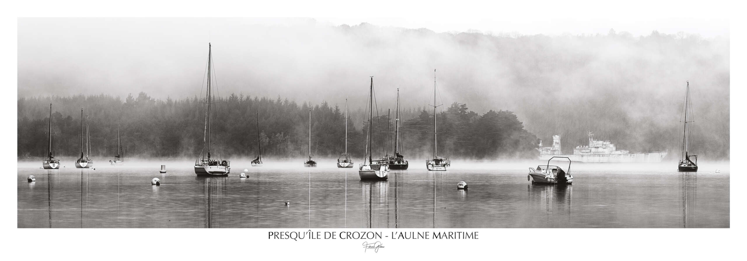 Affiche photo noir et blanc “Bateaux sur l’Aulne” — Aulne maritime dans le brouillard — 33×95 cm — Fabrice Gallou